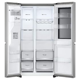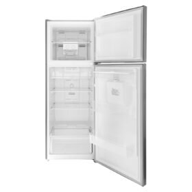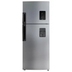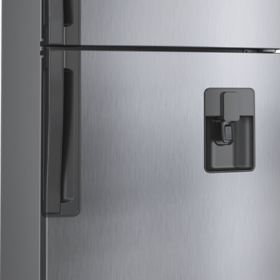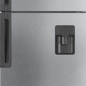 Refrigeradora Top Mount de 303 Lts con dispensador de agua exterior, superficie Anti Fingerprint y sistema de deshielo automático. Cuenta con tecnología 3D de distribución de aire, cajón para frutas y verduras, cajón con control de humedad, anaquel con capacidad de latas y capacidad para botellas, tanque de agua de 2 litros y luz Led