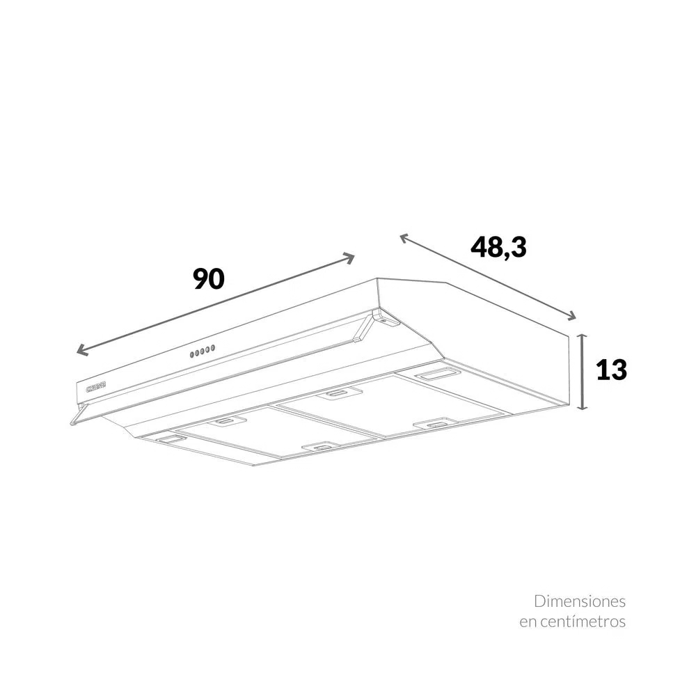 - Campana con frente y cuerpo en acero inoxidable de 90 cm de fácil limpieza