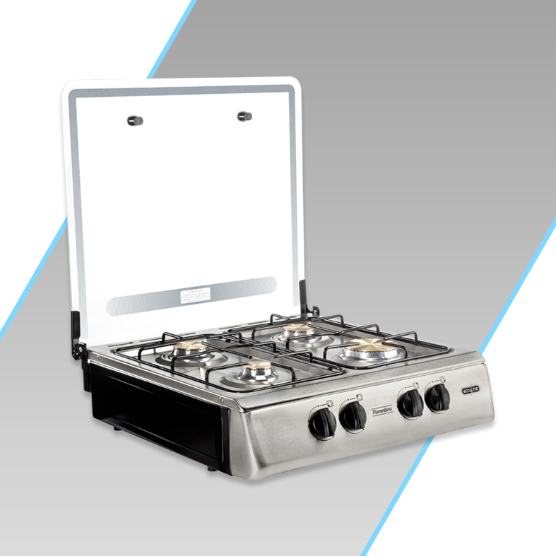 “Cocineta FIORENTINA 4Q con tapa de vidrio, acabado inox y color negro. Diseño moderno y eficiente, ideal para cocinas funcionales.”