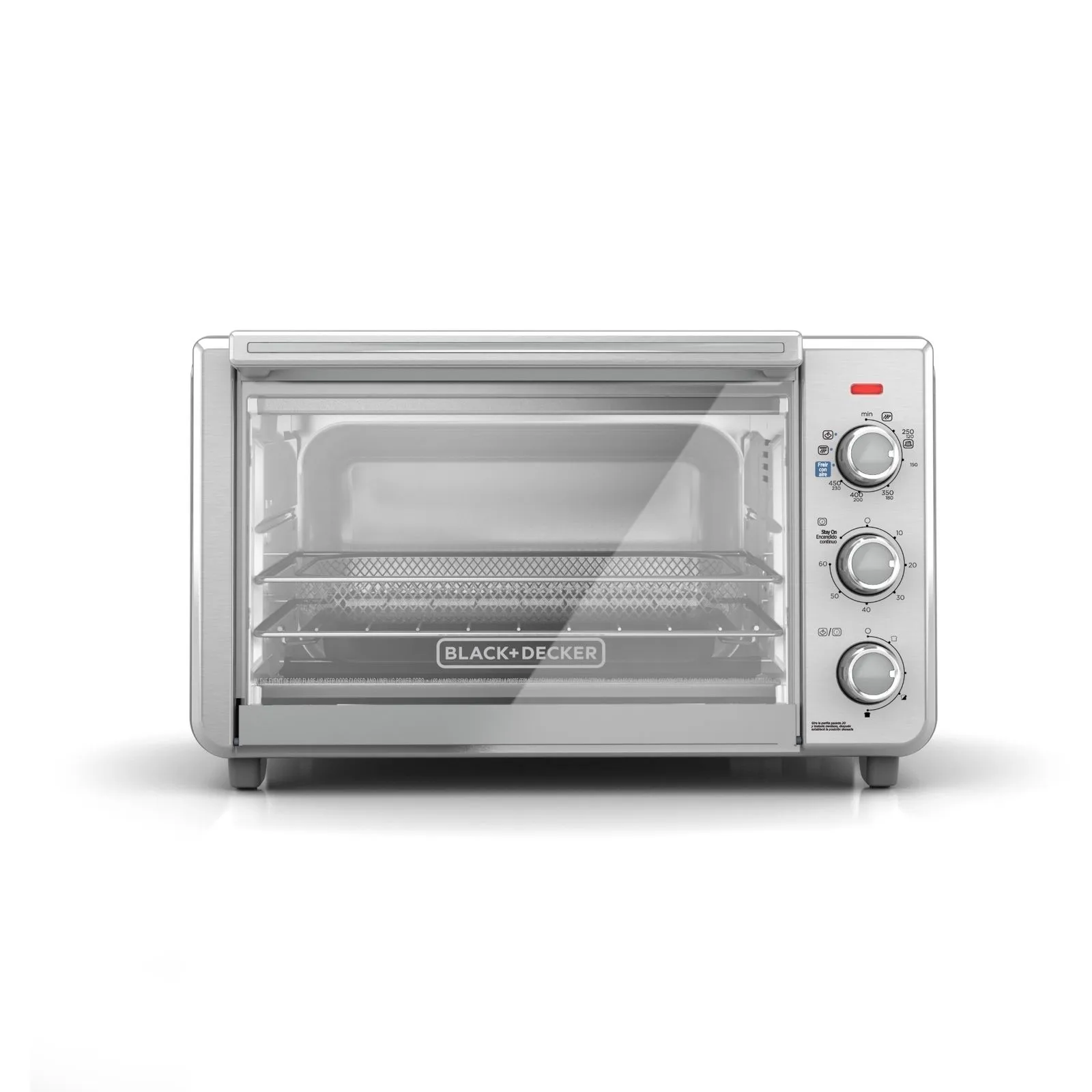 Presentamos la tecnología Air Fry, nueva en el horno tostador BLACK+DECKER Crisp ‘N Bake Air Fry. ¡Este es el sabor frito sin grasa! La tecnología Air Fry utiliza aire caliente de alta intensidad para hornear, dorar y dorar tus alimentos fritos favoritos con poco o nada de aceite. Pruebe papas fritas, chips de verduras, filetes de pescado empanizados, bocadillos congelados y mucho más. Hay espacio para hasta seis rebanadas de pan o una pizza de 12’. Tres perillas de control facilitan la configuración del temporizador de tostado y el temporizador de 60 minutos, y eligen entre cinco funciones de cocción: hornear, asar, tostar, mantener caliente y ventilar.