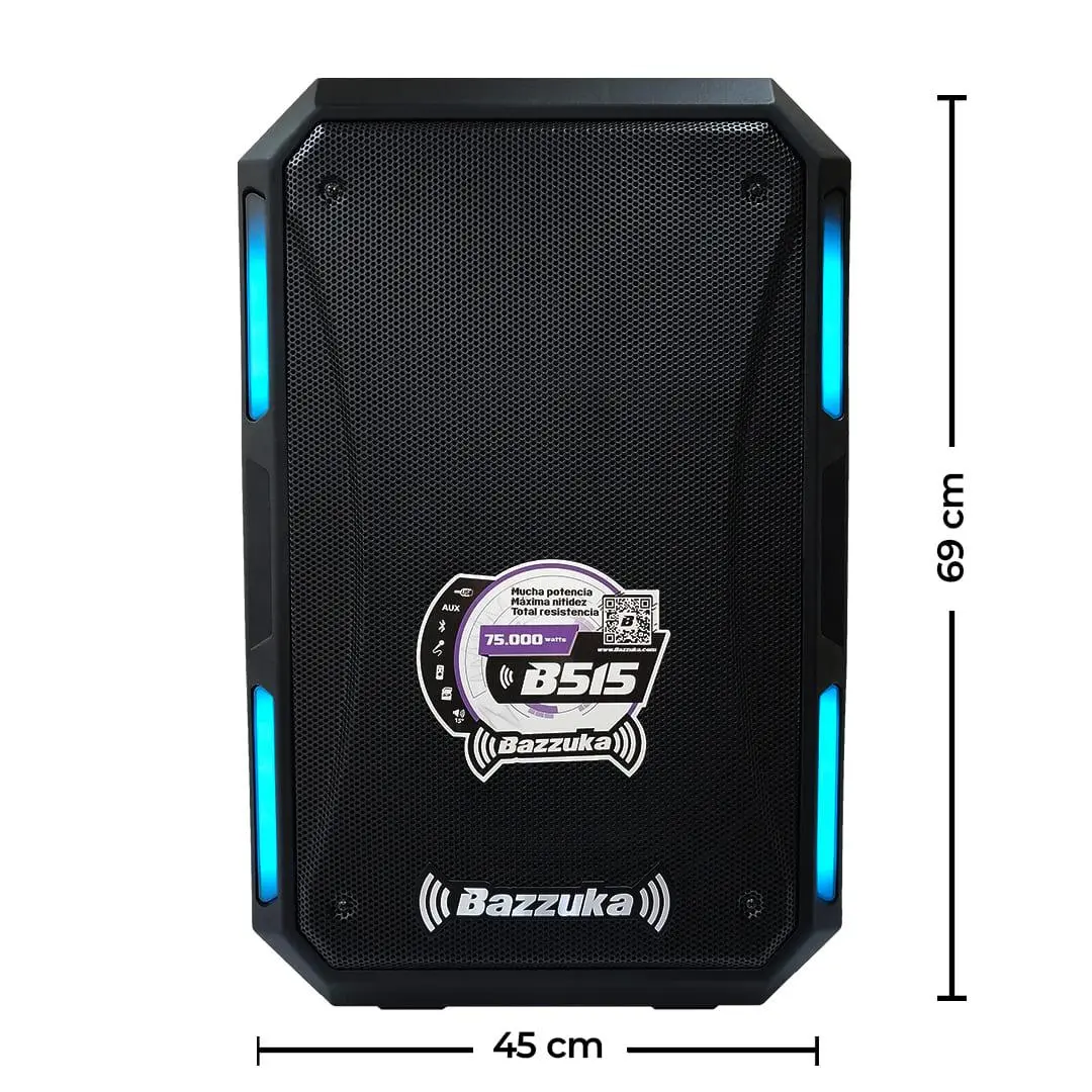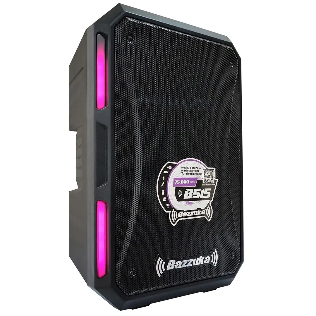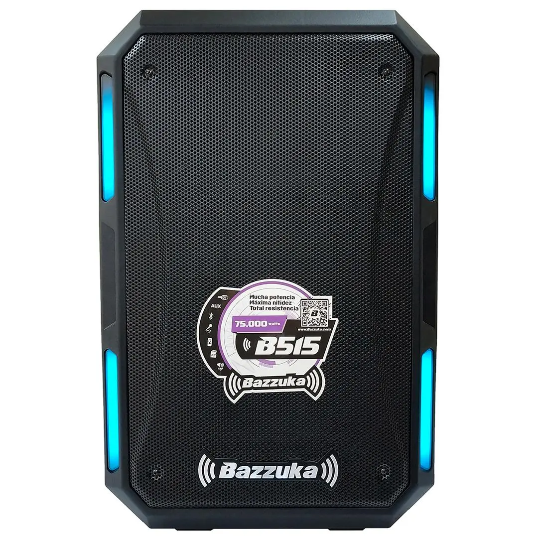 - Este parlante es perfecto para quienes buscan potencia, claridad y versatilidad en un solo equipo. Ideal para quienes organizan eventos de gran envergadura, el Bazzuka B515 asegura un sonido profundo y claro, tanto en los graves como en las frecuencias más altas.