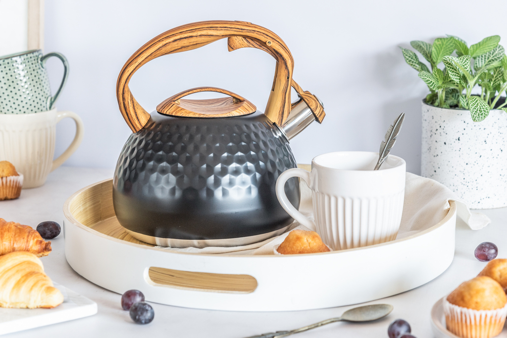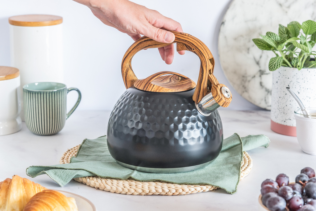 Tetera silbadora de acero inoxidable. Capacidad de 3 litros.